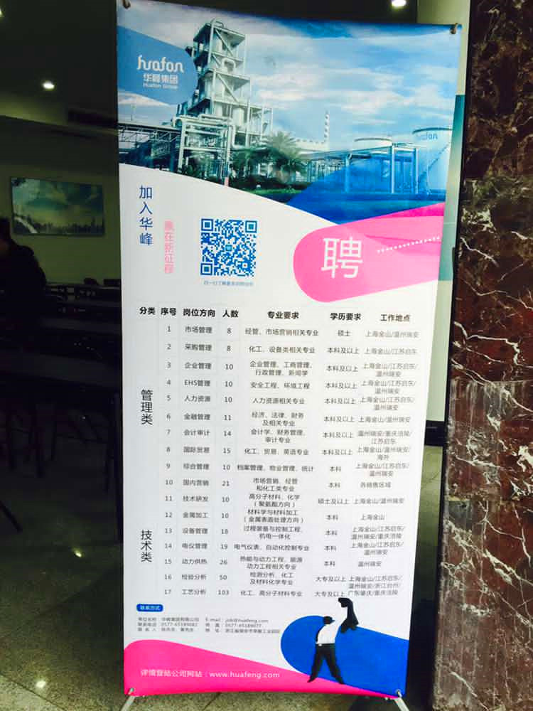 华峰是全球最大的聚氨酯鞋革树脂生产企业。长达九分钟半的宣传视频,让应聘者初步了解到了华峰集团在国内化工领域的邻先地位。从企业发展历程,到员工福利待遇,再到新的企业文化精神,华峰集团人力资源部的廖经理一一地为参加招聘会的学生进行了讲述。