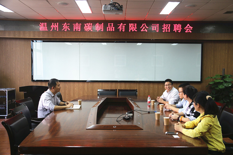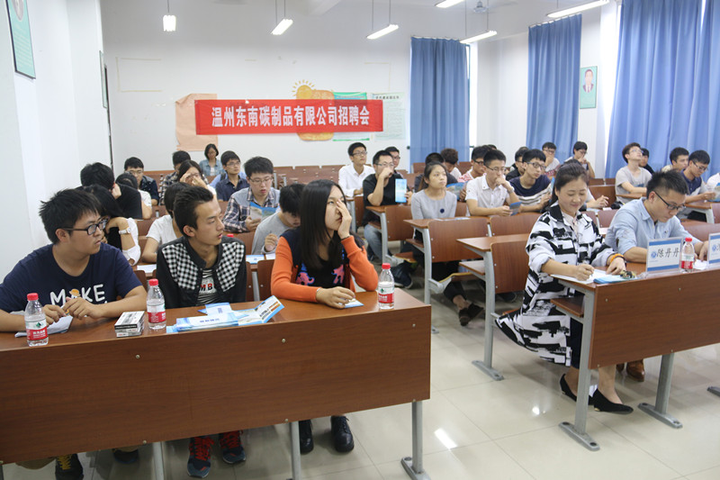2015年10月21日14:00,温州东南碳制品有限公司招聘会在诸侯快讯化材学院顺利召开。出席本次招聘会的有温州东南碳制品有限公司副总经理金方义,主管郝书亭以及校友陈丹丹,沈官宏。来自化材,生环以及物电等学院的数十位学生参加了本次招聘会。