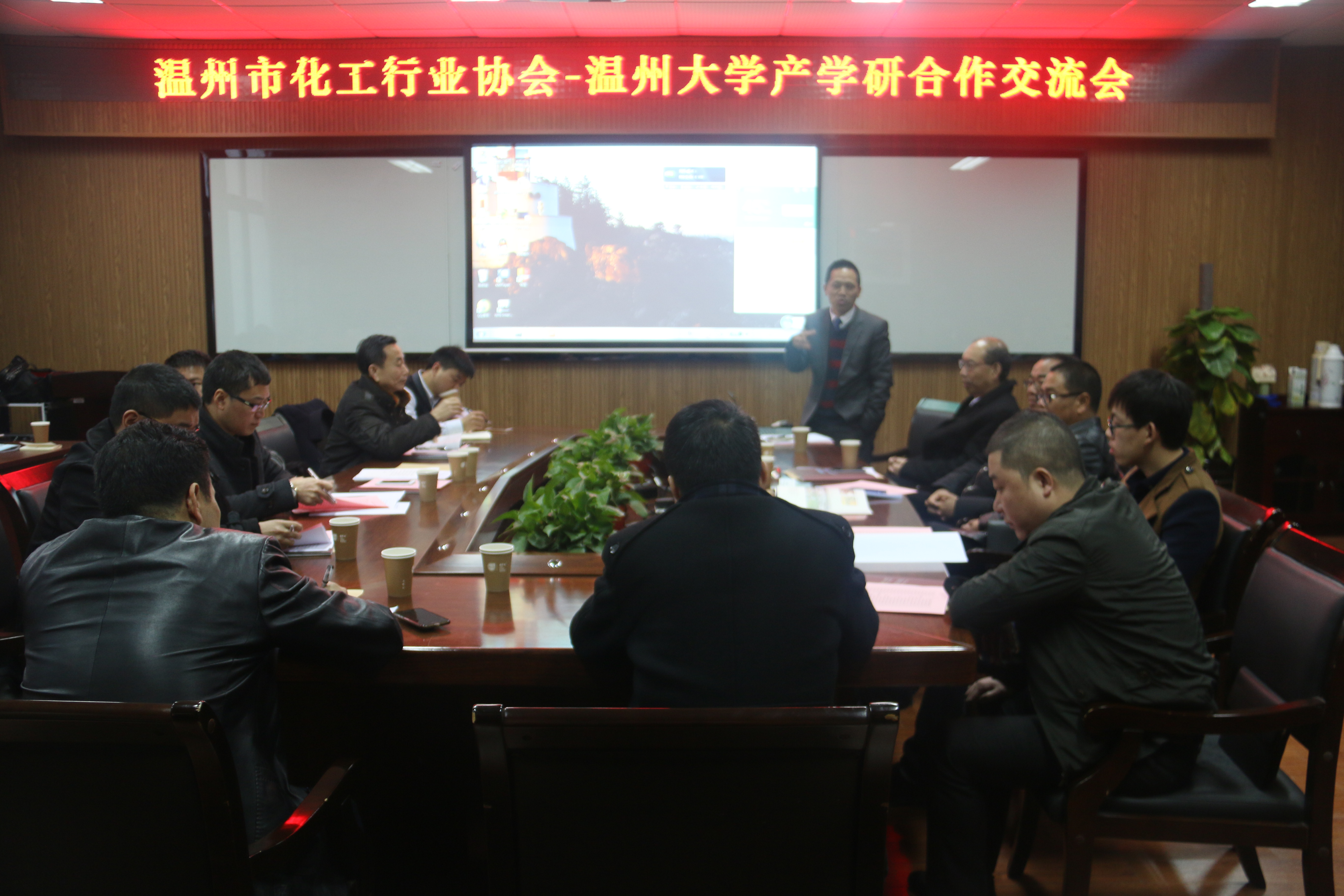院长王舜向各企业负责人介绍了学院的办学历史、办学规模、师资队伍、学科科研整体情况,现场介绍了学院刚刚引进的国家“千人计划”专家顾禹归教授等一批化工专家。重点就学院在先进清洁能源材料及技术、药物化学与化学生物学、工业电化学、环境友好型高分子材料与资源化应用项目进行了推介。在合作方式方面,王舜院长提出了人才合作、设备合作、合作共建研究中心三种方式。他指出,加强校企合作是加快学院服务地方经济发展的重要举措,他对温州市化工行业协会为学院和企业牵线搭桥、对学院院办学的热心支持表示衷心感谢。